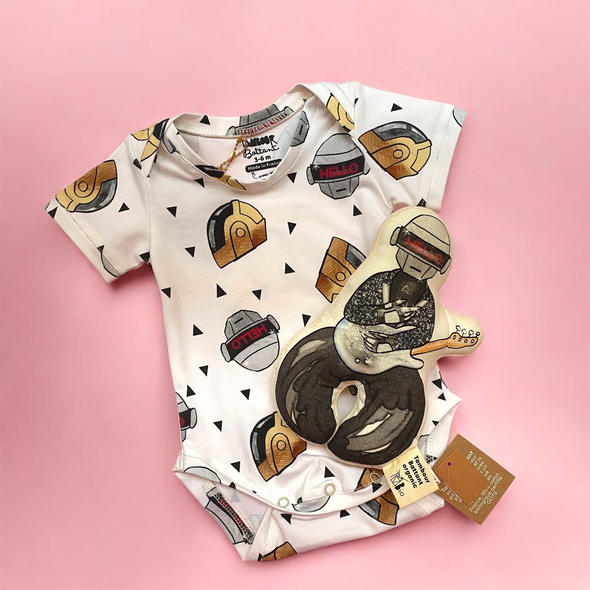 La boite contient un body "soft punk" + un hochet robot silver + une carte de voeux robot.